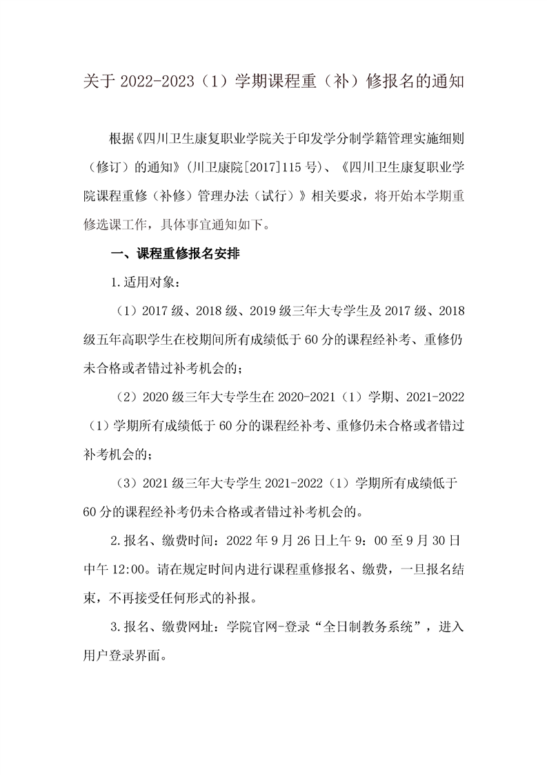 关于2022-2023(1)学期课程重(补)修报名的通知