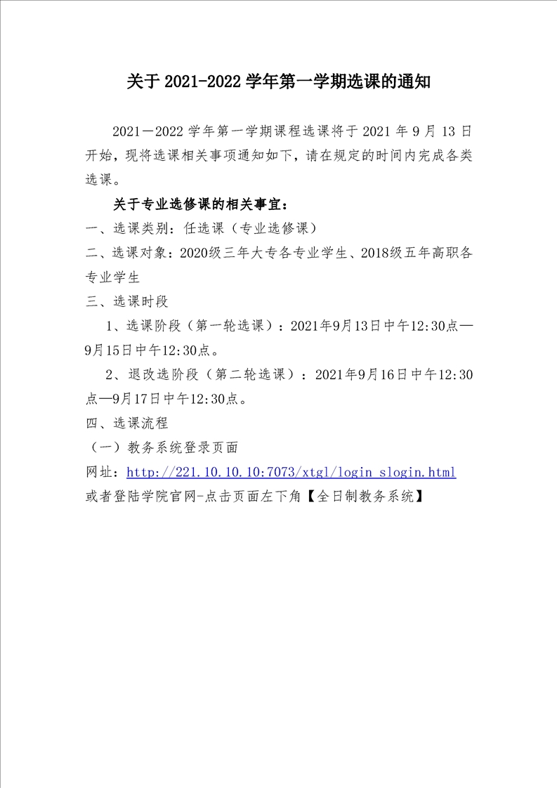 关于 2021-2022 学年第一学期选修课选课的通知