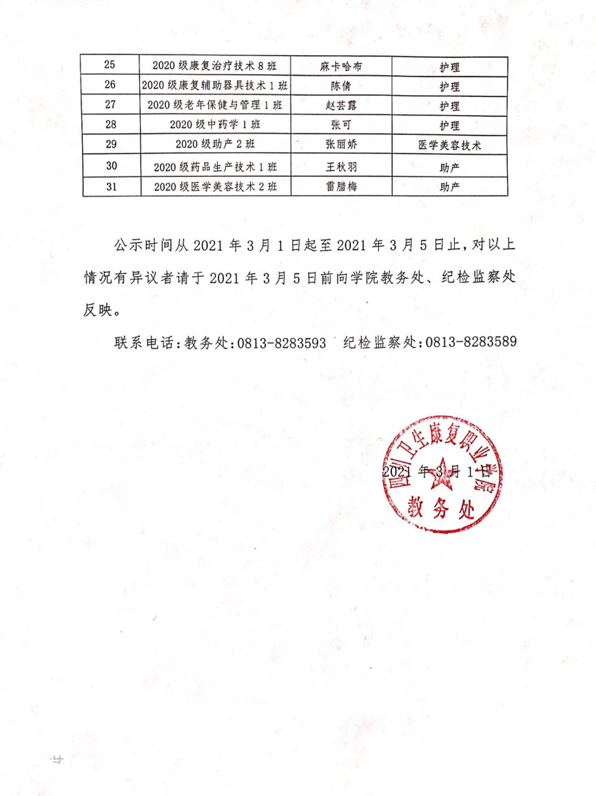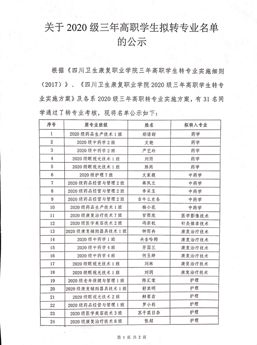 关于2020级三年高职学生拟转专业名单 的公示