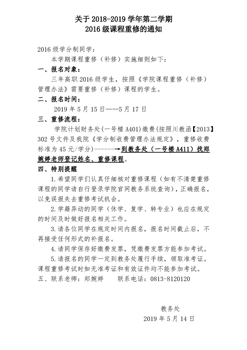 关于2018-2019学年第二学期 2016级课程重修的通知