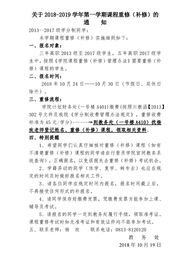 关于2018-2019学年第一学期课程重修(补修)的 通知