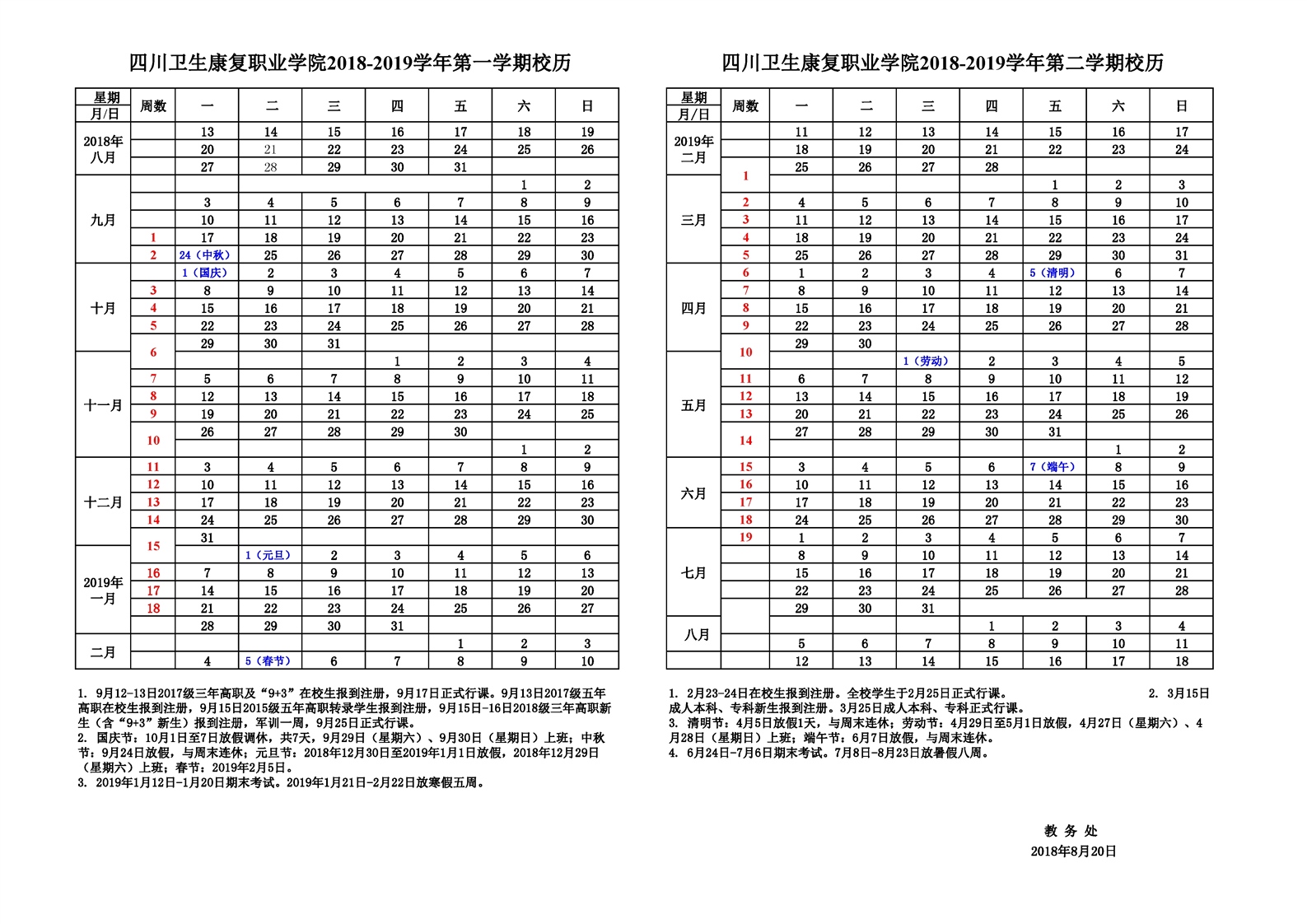 2018-2019学年校历