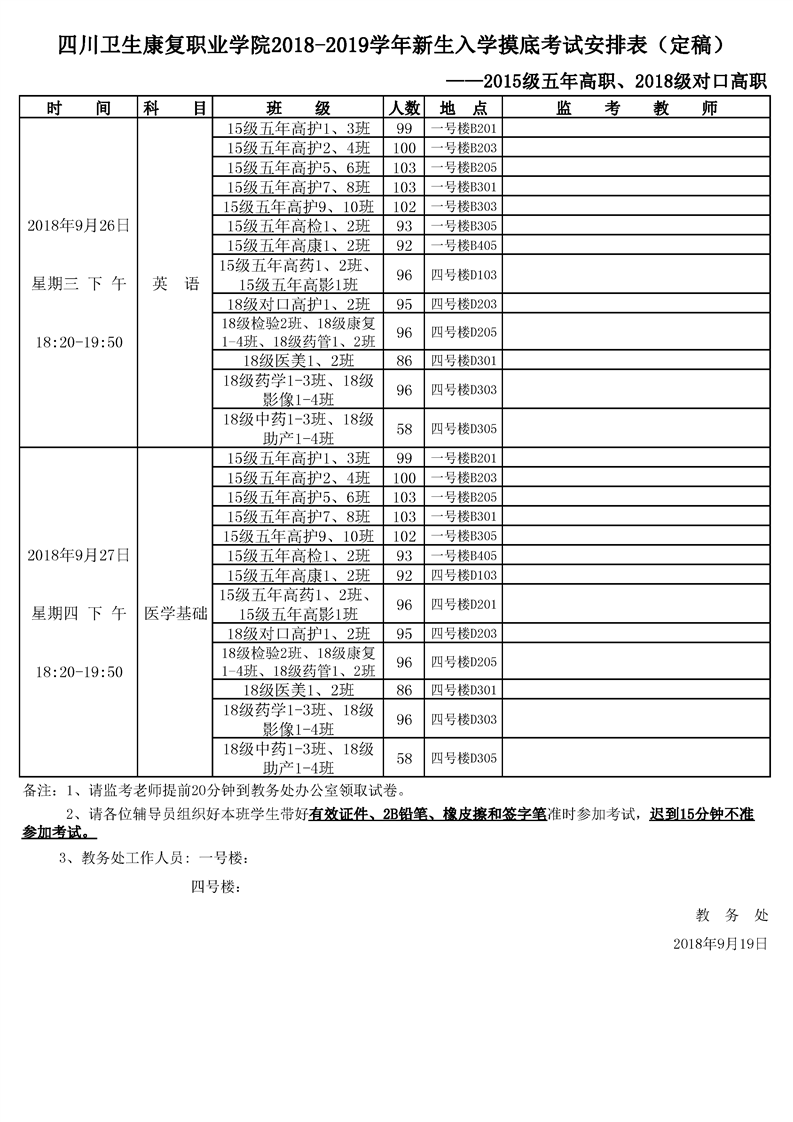 KY开元集团官网2018-2019学年新生入学摸底考试安排表