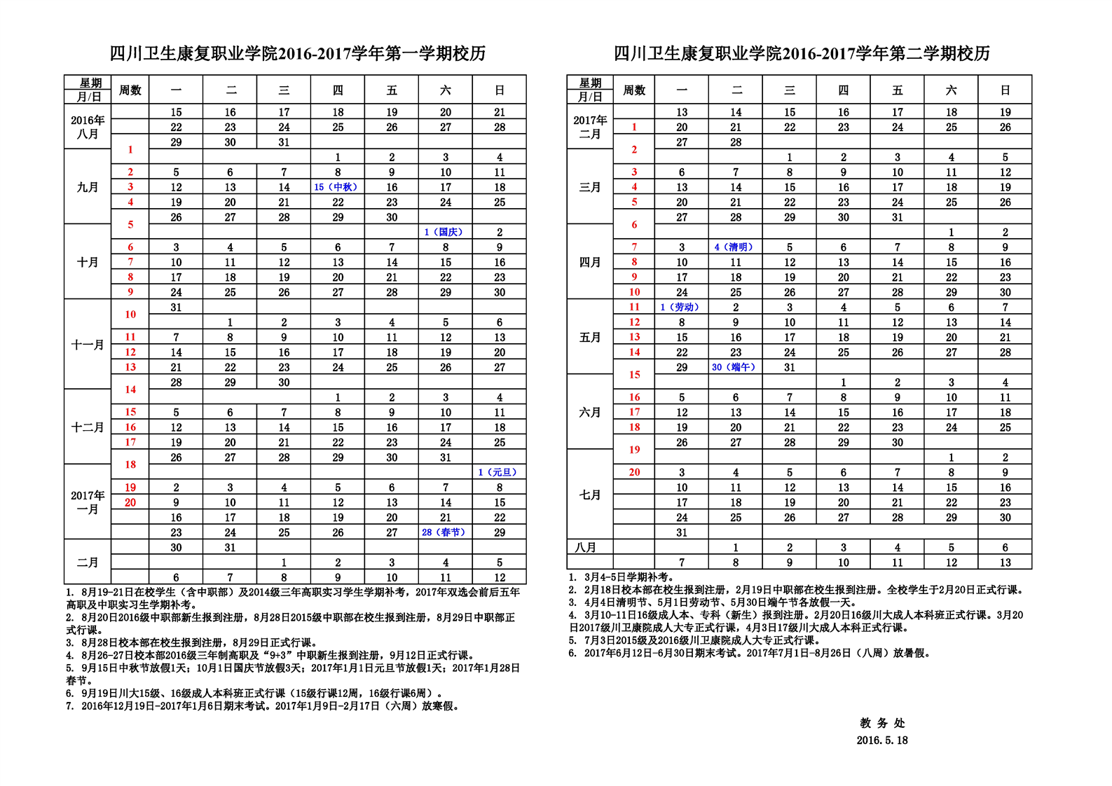 KY开元集团官网2016-2017学年教学日历