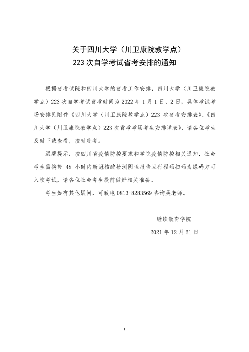 关于四川大学(川卫康院教学点)223次自学考试省考安排的通知
