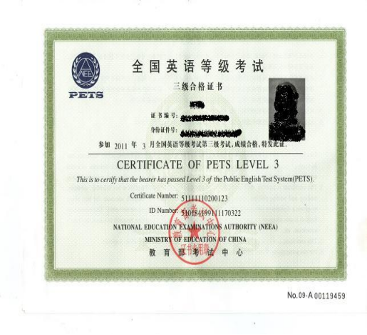 (3)全国英语等级考试证书(PETS)复印件;
