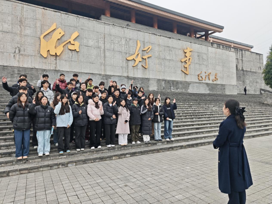 活动以“沉浸式学习”拉开序幕。师生们怀着对革命先辈的崇敬之心,从创业中心奔赴目的地。车程中的“车上微课堂”精彩纷呈:学生代表讲述吴玉章东渡日本求学、参与组建同盟会的救国历程,其“惊怵于亡国的危险,不得不奋起图存”的赤诚之心引发学子“少年强则国强”的共鸣;《歌唱祖国》等红色歌曲激昂唱响,传递信仰力量;党史知识问答环节大家踊跃抢答,将党性教育在轻松互动中入脑入心,为活动奠定浓厚红色基调。
