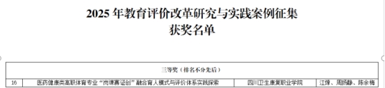近日,四川省教育评估院公布2025年教育评价改革研究与实践案例获奖名单,开元官网江燎、周扬静、陈余梅教师团队提交的《医药健康类高职体育专业“岗课赛证创”融合育人模式与评价体系实践探索》案例荣获三等奖。