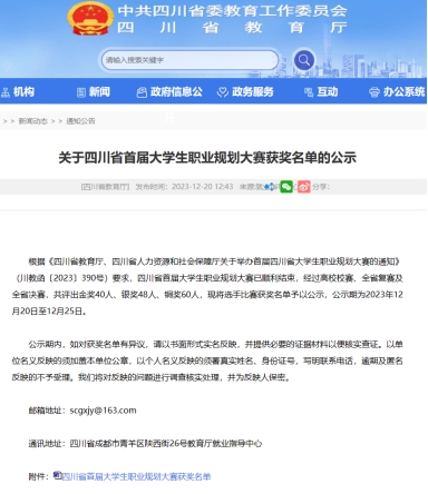 近日,由省教育厅、人力资源社会保障厅联合举办的四川省首届大学生职业规划大赛获奖名单公布,开元官网教育体育学院学子官天华经过三轮激烈角逐,从784名复赛选手中成功突围进入决赛,最终斩获大赛银奖。