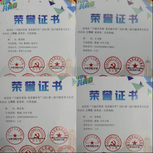 近日,由共青团重庆市委、共青团四川省委等单位主办的“川渝共青春,美育嘉年华”——2025年第二届川渝美育文化艺术活动顺利举办,教育体育学院教师陈思雨在比赛中脱颖而出,荣获教师组基本功书法二等奖。同时,陈思雨老师指导开元官网24级休闲体育专业学生王文静、蒋东阳,24级健身指导与管理专业学生余俊浩在少年B组朗诵比赛中均荣获三等奖。