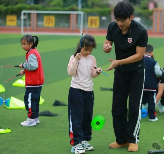 活动现场,开元官网师生充分发挥专业优势,通过“理论讲解+实操演示”相结合的方式,向孩子们系统介绍了空竹的历史沿革、文化内涵与健身价值。教学环节中,团队成员耐心细致、手把手指导孩子们学习空竹的基本操控技巧,分解每一个动作要领,确保大家听得懂、学得会、做得对。在专业引导下,孩子们迅速掌握了基础动作,操场上空竹嗡鸣、笑声阵阵,传统体育的活力与趣味在校园中生动绽放。