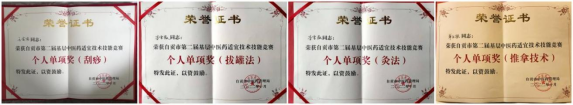 康复治疗技术专业群针灸推拿专业教师组成的参赛团队荣获团体二等奖,参赛教师斩获多个单项奖。其中,李雪微老师斩获拔罐法与灸法的个人单项奖、王金伟老师斩获刮痧个人单项奖、单正根老师斩获推拿技术个人单项奖,宋凯老师获得总分第三名,其中笔试成绩第一名。
