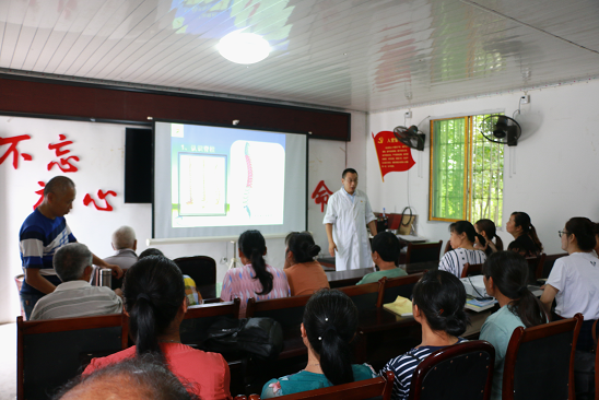 康复系党员教师单正根为该村群众带来了“脊柱的日常保健”健康知识讲座。在讲座过程中考虑到“学生”文化现状以及对医学相关知识的接受程度,单老师采用最接地气且通俗易懂的四川方言讲述,运用讲练结合的形式充分调动村民们的积极性。