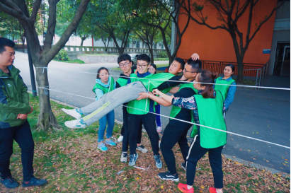 【穿越丛林】每队10人,10人为一组,10人排成一列每人依次手搭在前一个人肩膀上,前9个人用眼罩蒙住眼睛,最后一个人可以看见障碍物,然后通过自己的队伍所设置的方式前行,在终点拔下旗帜,前行途中不能说话,不能摘下眼罩。