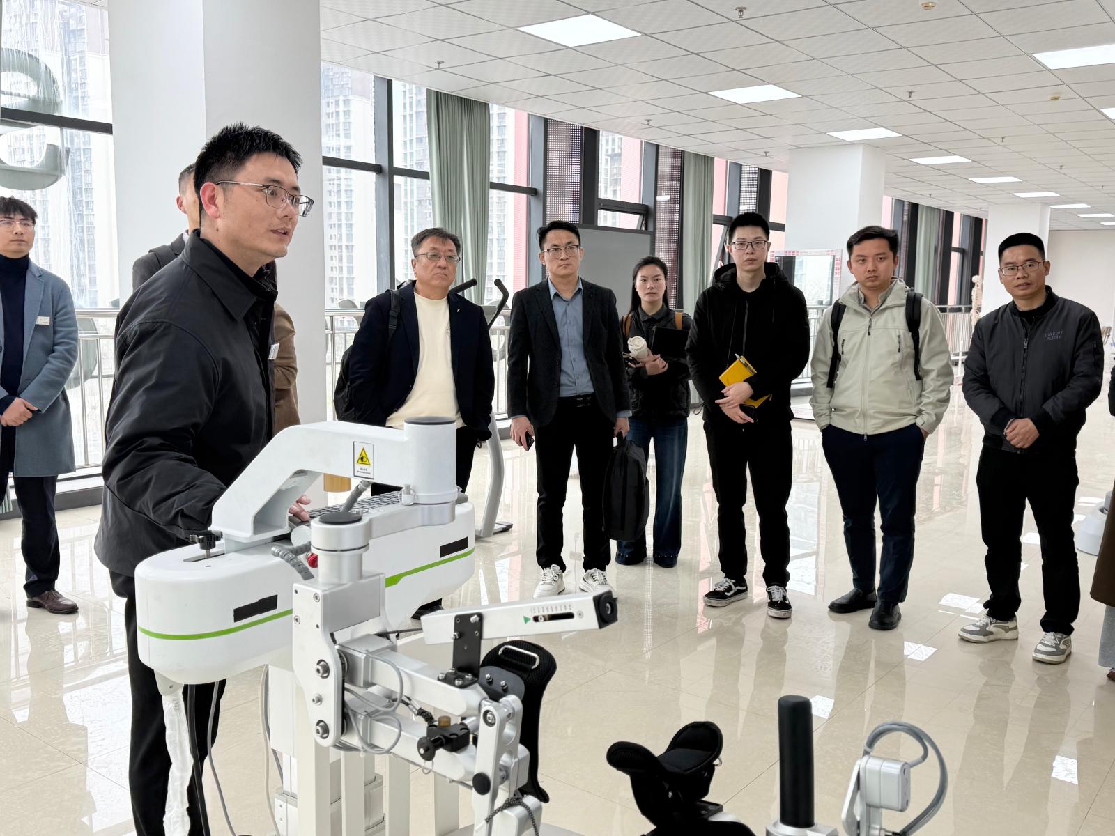考察团实地走访创新创业中心大楼智能康复区、评定中心等核心区域,观摩智能康复机器人、3D智能加工设备等前沿教学设施。李勇书记详细介绍学院“政行企校院”五维协同机制,以及联合头部企业打造“研发+实训+成果转化”一体化平台的实践,阐述学院将企业真实生产场景、行业技术标准、岗位实操要求融入课程体系,打造沉浸式实训平台,实现人才培养与康养产业发展同频共振的育人逻辑,直观呈现实训教学与产业需求无缝对接的落地场景。