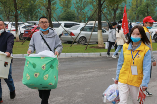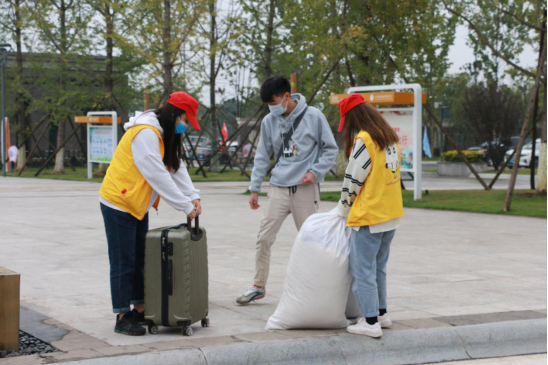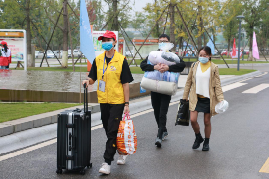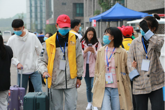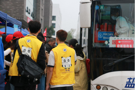 志愿者迎接下车的新生们