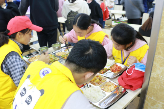 为不耽误迎接新生赶紧匆忙吃饭的志愿者