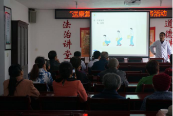 康复大讲堂——单正根老师正在给社区居民讲解脊柱病产生的原因以及疾病预防的知识。