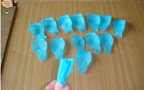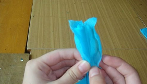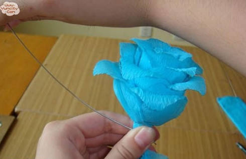 第五步:将花瓣分开,先用刚刚剪花瓣剩下的皱纹纸做出花蕊,包好花瓣即可