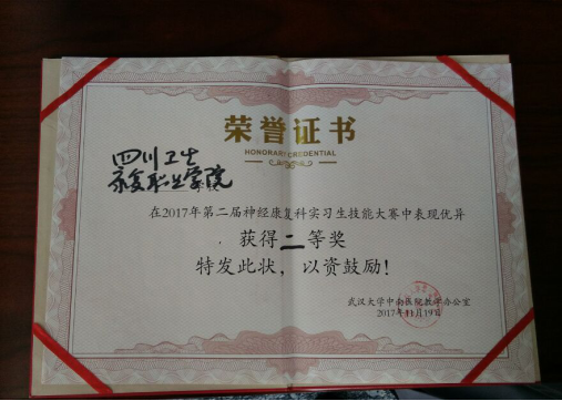 组成“梦之队”的成员分别是15级康复1班的何晗,康复2班周忠焰和康复4班的彭怡。三个小娘子凭着精益求精,和谐进取的精神,不骄不躁,稳定发挥,最终为学院取得了好成绩。据悉这次比赛由来自全国各地学院组成的11支队伍参加,赛后武汉大学中南医院还设置了颁奖典礼对获奖团队予以表彰。