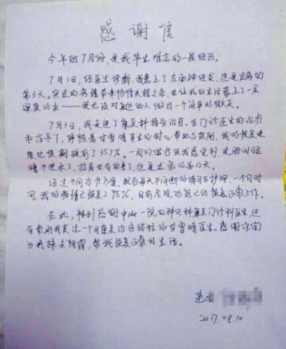 该患者于今年7月1日被确诊为左面神经炎,“连一个简单的微笑都无法做到”,突发的病情让患者彷徨失措。甘雪晴同学作为患者的治疗师,对其耐心地鼓励、认真地帮助,结果患者的恢复进度比预期提前了35.7%,配合每天不间断的练习和护理,一个月后患者已恢复了95%,目前已恢复正常生活。患者真诚地感谢了为其服务的医生,并特别感谢了在治疗中一直给予他鼓励和帮助的甘雪晴同学。