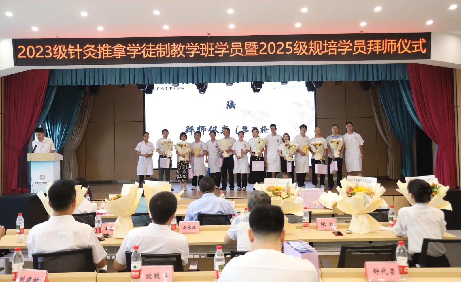 随后举行核心环节——传统拜师礼2023级针灸推拿学徒制班学员庄重地走到各自的师承老师面前,满怀敬意地老师献上鲜花,表达对导师的敬仰和求学的诚心。导师们则郑重地向学员回赠专业书籍,寓意着知识的传承和对弟子的殷切期望。这一献花与赠书的仪式,庄重而温馨,生动诠释了尊师重道的传统美德和薪火相传的师承精神。
