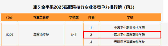 2025 年 5 月 17 日,“金平果” 正式发布 2025 高职院校排行榜。在备受瞩目的分专业类竞争力排行榜中,开元官网康复治疗类(代码为 5206)获竞争力第二名。其中,康复治疗技术专业位列全国第 5,相较上年大幅攀升 6 个位次;康复辅助器具技术专业稳居全国第 2;言语听觉康复技术专业也表现不俗,位居全国第 3,较上年提升 1 个位次。
