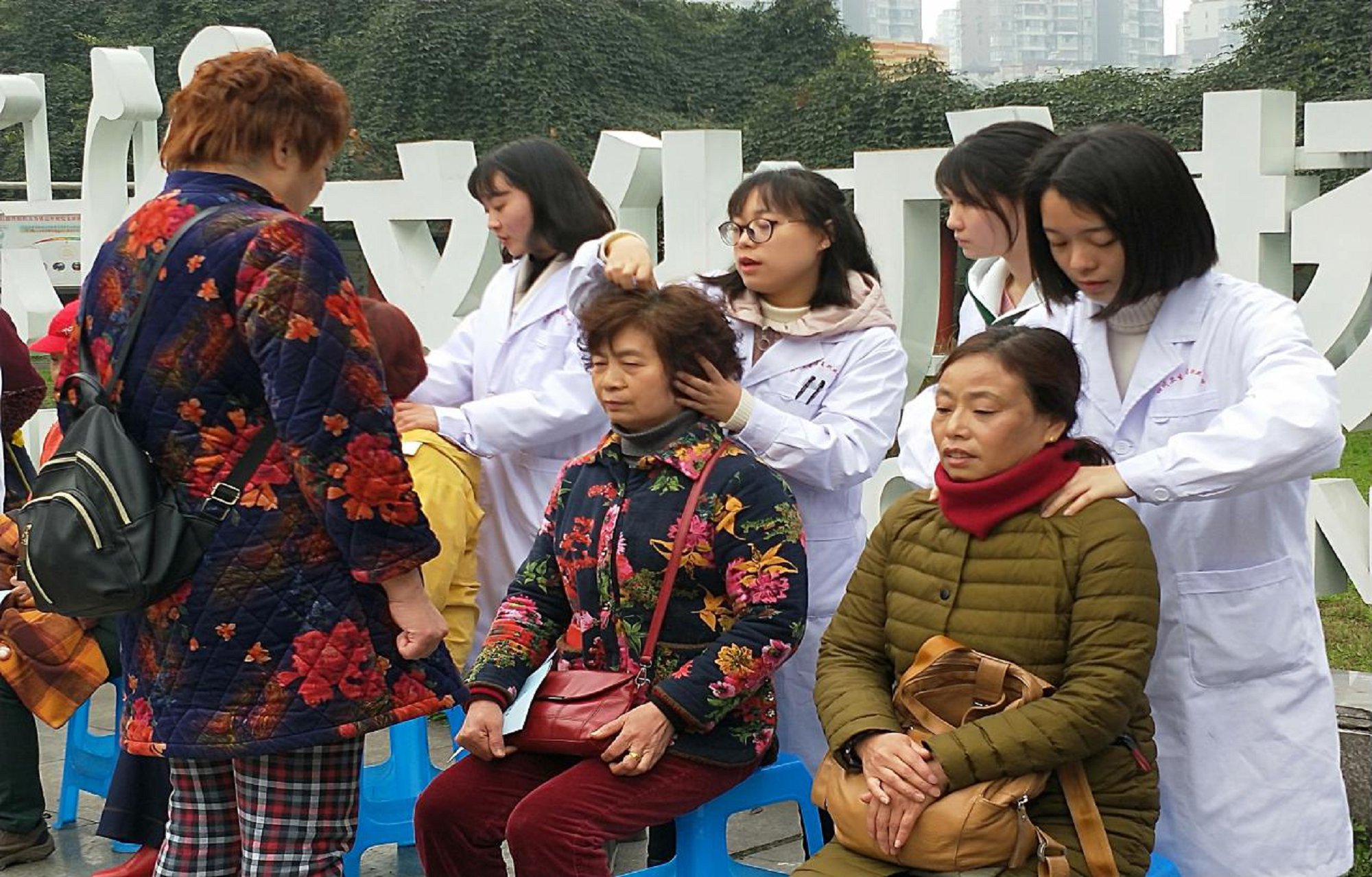 讲座结束后,田老师带领同学到广场为社区居民进行传统手法治疗和理疗服务。居民参与积极性高,同学们也能很好的将书本上学到的知识运用到实践中,一边做手法按摩一边对他们讲授疼痛点致病的原因和日常预防措施,使她们心情处于放松状态的同时帮助她们减轻疼痛感。田老师还现场为大家介绍了一些在日常生活中可以自己进行按摩缓解痛感的穴位。