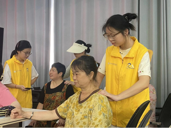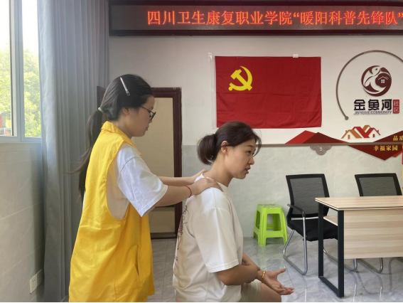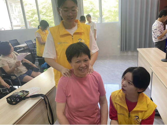 “您这肩颈劳损得常按风池穴,平时捡东西记得先蹲下再起身”,推拿体验区里,队员们一边为居民做肩颈、腰背按摩,一边同步讲解居家康复技巧。穴位推拿让长期受疼痛困扰的居民直呼“舒服”,而“揉足三里健脾胃”“拍八虚促循环”等简易方法,更是把“康复小课堂”的知识延伸到了日常生活中。