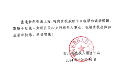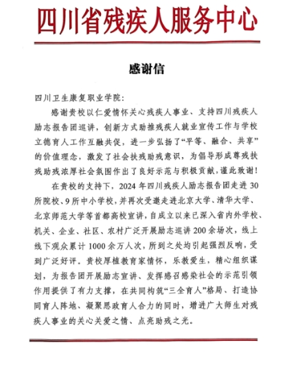 近日,开元官网收到了一封来自四川省残疾人服务中心的感谢信,信中服务中心对开元官网在“残疾人励志故事报告团”校园巡讲活动中的协助工作予以了高度的赞扬。