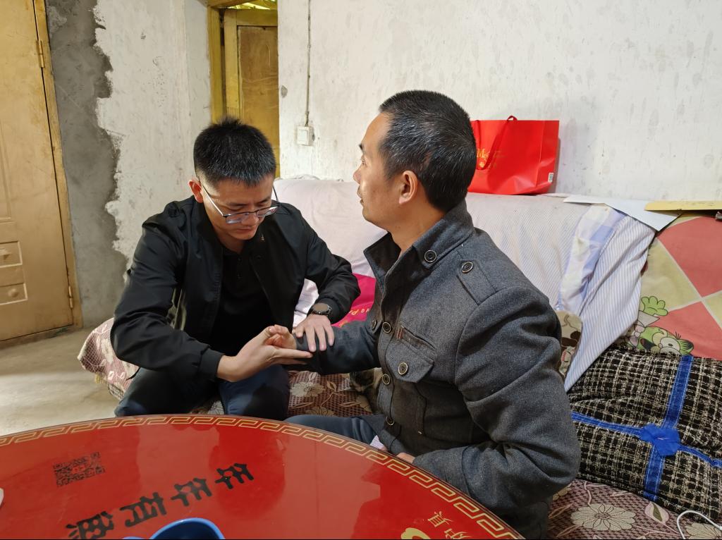 在走访慰问村重点人群时,得知两名村民有强烈的康复需求,便随即前往村民家中探访。针对其中一名因脑卒中导致右侧偏瘫的村民,牟杨耐心地对其居家牵伸、恢复关节活动等进行指导,给予患者和家属居家康复措施建议。
