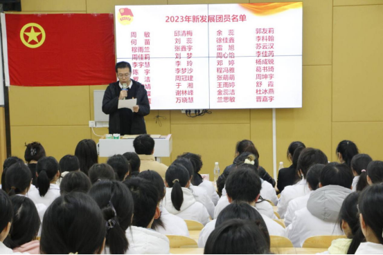 第一项议程,2023年新团员入团仪式。卫琛宣读2023年新团员名单,希望新团员要履行团的义务,执行团的决议,在学习贯彻习近平新时代中国社会主义思想中打牢青春航向,发扬斗争精神,勇担时代重任,展现青春风貌。