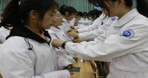 卫琛、陈雯彦、刘斯吉及优秀团员代表为新团员佩戴团徽、发放团员证。