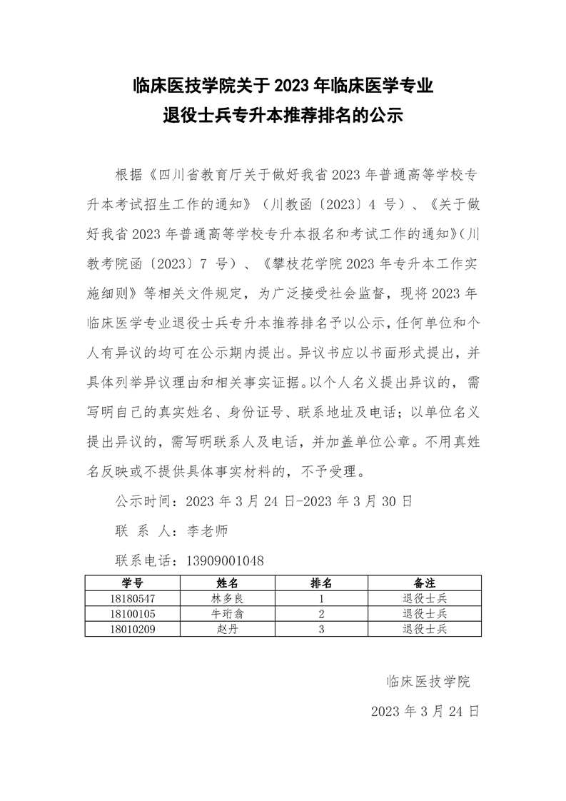 临床医技学院关于2023年临床医学专业退役士兵专升本推荐排名的公示