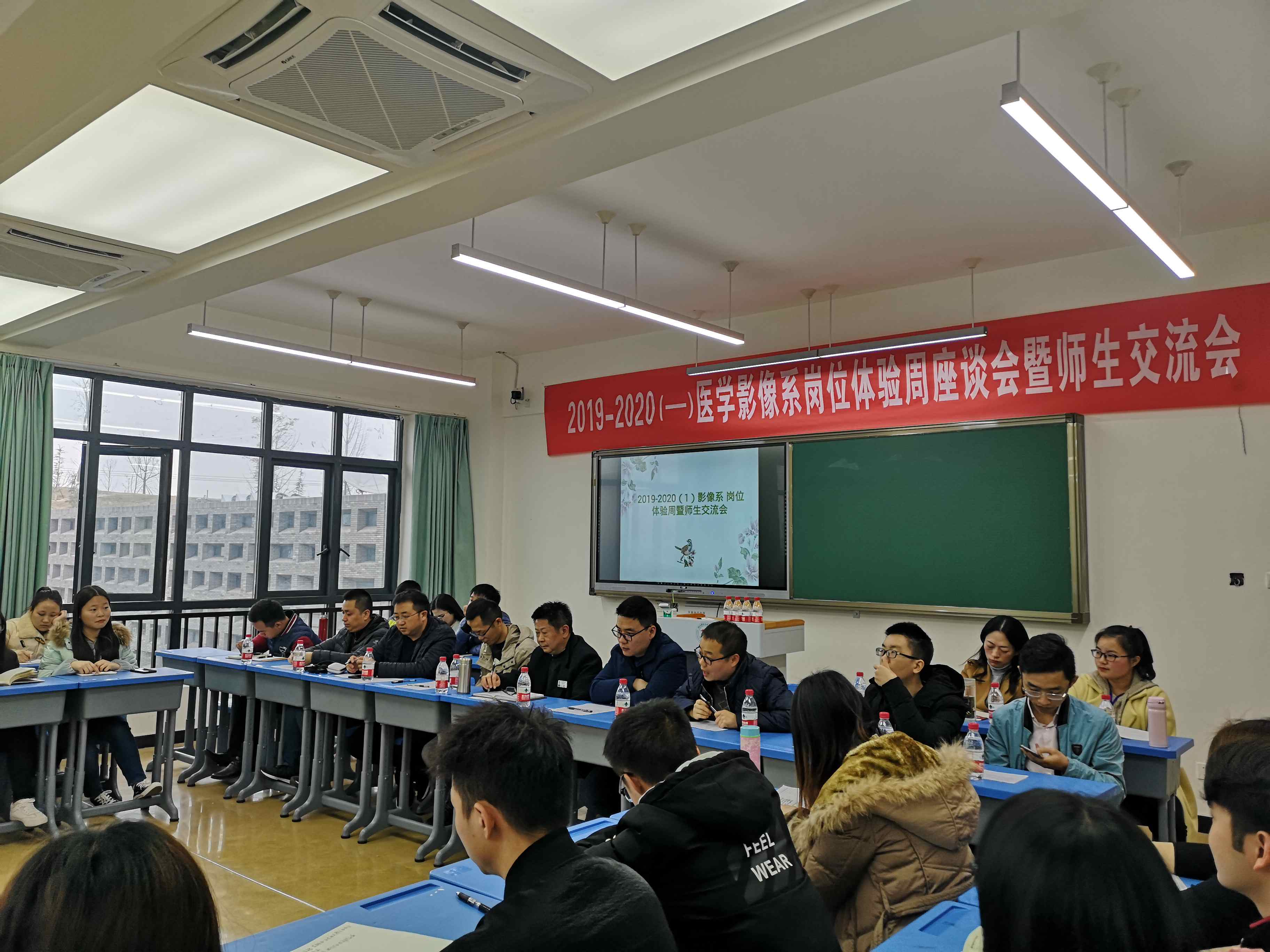 为进一步加强师生之间的交流,分享岗位体验周的经验心得,使同学们在日常学习中有一个明确的目标进而对未来的职业规划有一个清晰的认识,我系于2019年12月11日在二教B503举办了2019-2020(一)岗位体验周座谈会暨师生交流会。出席此次活动的有医学影像系主任刘文军、附属自贡市第一人民医院、第四人民医院各科室代表、系部教师及各班学生代表。