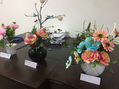 之后,于12月3日19:10二号教学楼b区307上交作品并做好登记,工作人员对其经行摆放和编号,第二天由系部老师共同评选。经老师商议得出一个一等奖,两个二等奖和三个三等奖。分别是一等奖纸艺雏菊,二等奖丝网加棉玉兰和丝网牡丹太阳花,三等奖丝网跳舞兰、纸艺桔梗花、纸艺牡丹,及优秀奖。