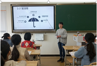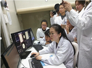见习前李老师给同学们布置见习任务,同学们分组来到CT及图像后处理进行学习,带教老师们一丝不苟地向同学们展示了各种设备具体操作、流程及注意事项。并着重强调了对患者的关怀与保护。同学们认真的聆听并积极主动向带教老师提出问题。通过医教融合的模式将书本的枯燥的理论知识和实践操作相结合,课后以PPT形式完成见习报告,并小组为单位展示见习成果。最终达到了强化技能操作同时注重人文素质的培养。
