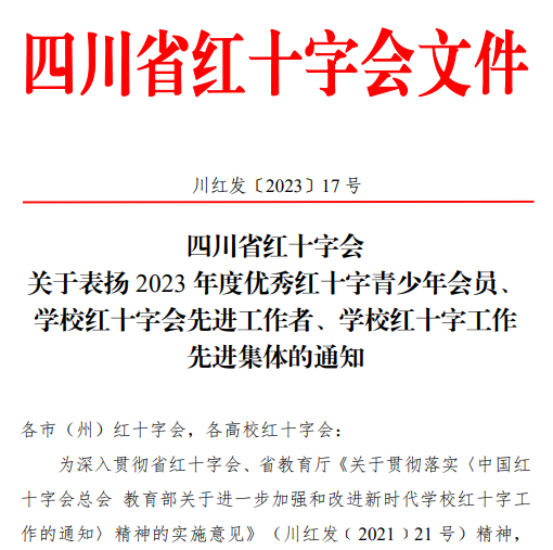 喜报:临床医技学院副院长刘孝桢荣获四川省红十字会2023年度“学校红十字会先进工作者”称号。