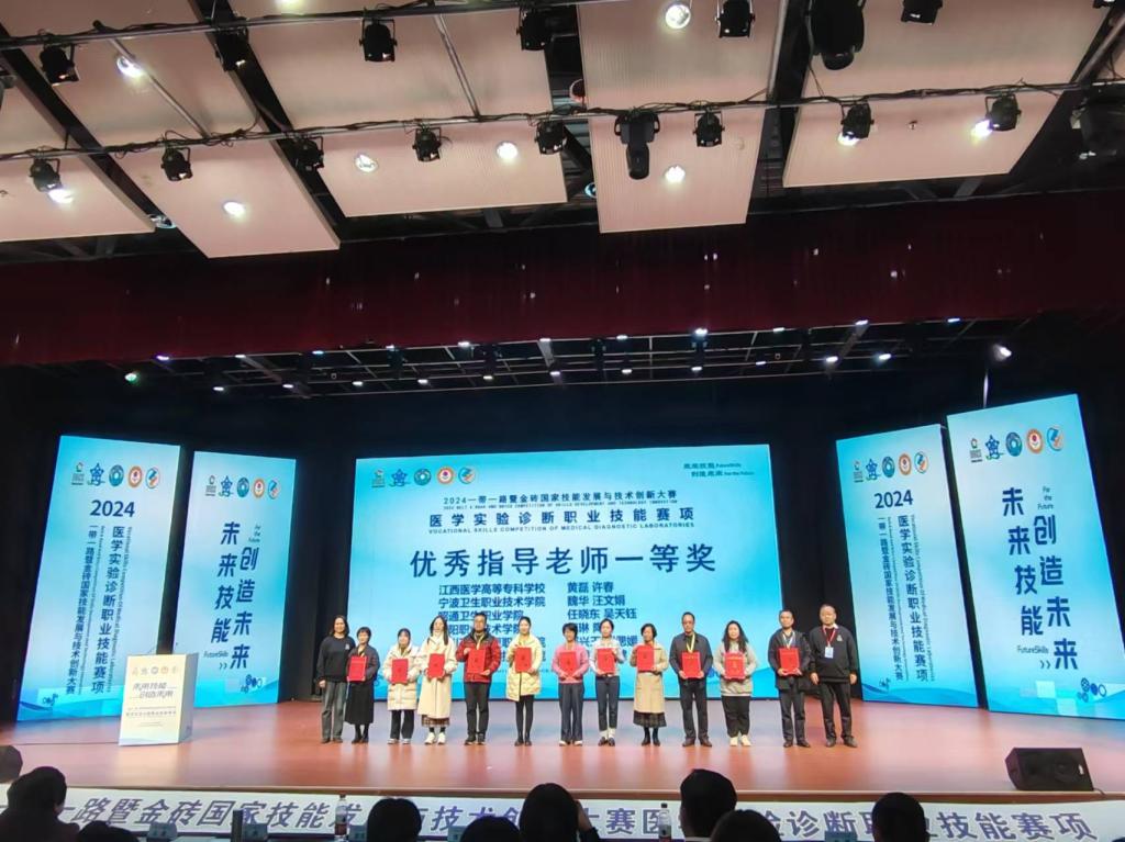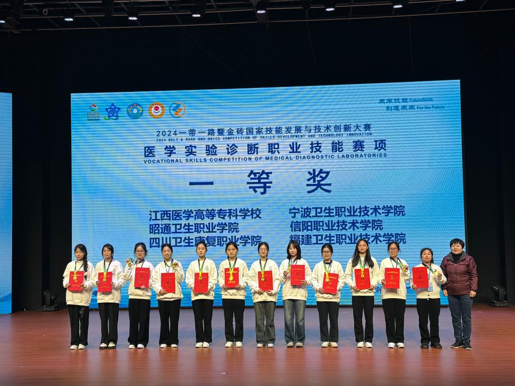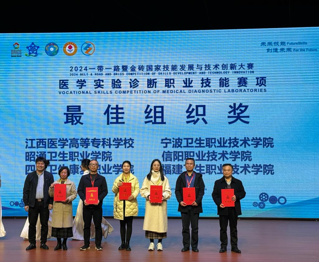 喜报:2024年11月22日-23日,在河南信阳职业技术学院举办的2024年“一带一路”暨金砖国家技能发展与技术创新大赛医学实验诊断职业技能赛项中,医学检验技术专业学生陈怡,邹燚琴获金奖,学校被评为最佳组织奖,邹兴玉、刘偲媛老师荣获优秀指导老师一等奖。