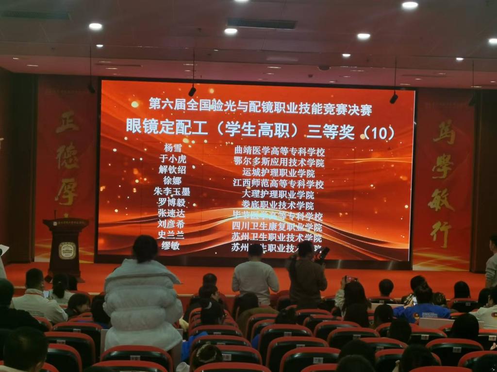 喜报:2024年11月22日-25日,在江苏省丹阳市南京师范大学中北学院举行的第六届全国验光与配镜职业技能竞赛中,2022级眼视光技术专业刘彦希获定配组三等奖,尹素素、朱盛勇老师荣获优秀指导教师。