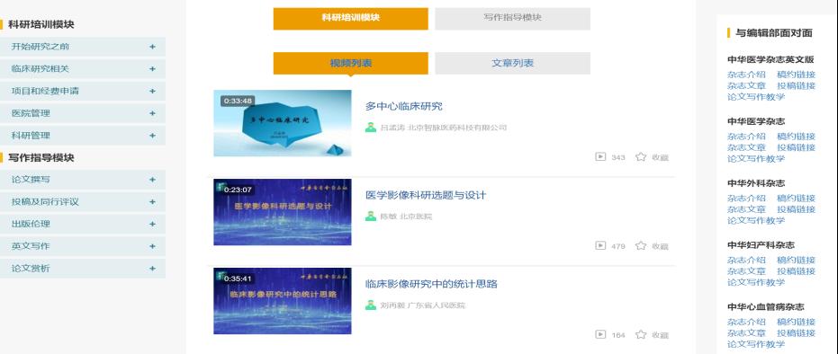 3.1科研培训模块为研究者提供选题、临床研究全过程、项目申请、科研管理、医院管理五个方向的学术支持。