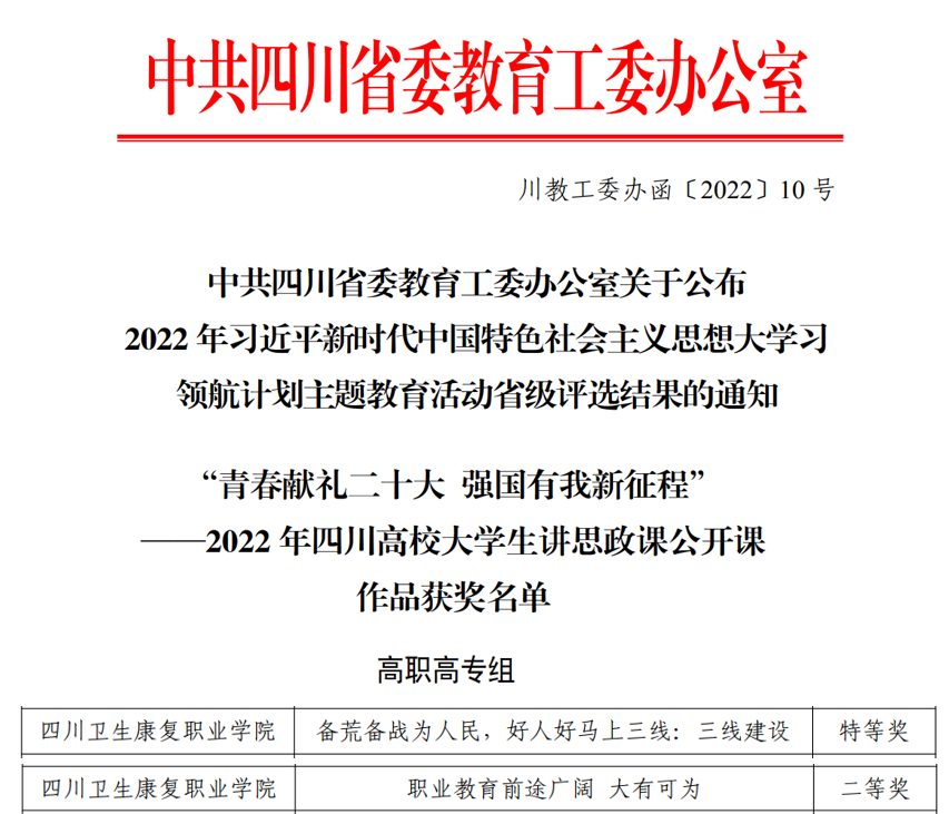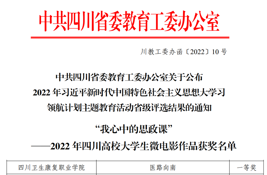 近期,中共四川省委教育工委公布了2022年习近平新时代中国特色社会主义思想大学习领航计划主题教育活动评选结果,马克思主义学院教师团队指导的“大学生讲思政课”2项作品斩获高职高专组特等奖和二等奖,指导的“我心中的思政课”1项微视频作品斩获一等奖(不分本专科)。