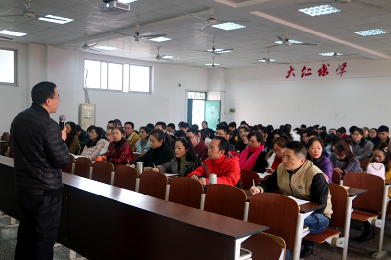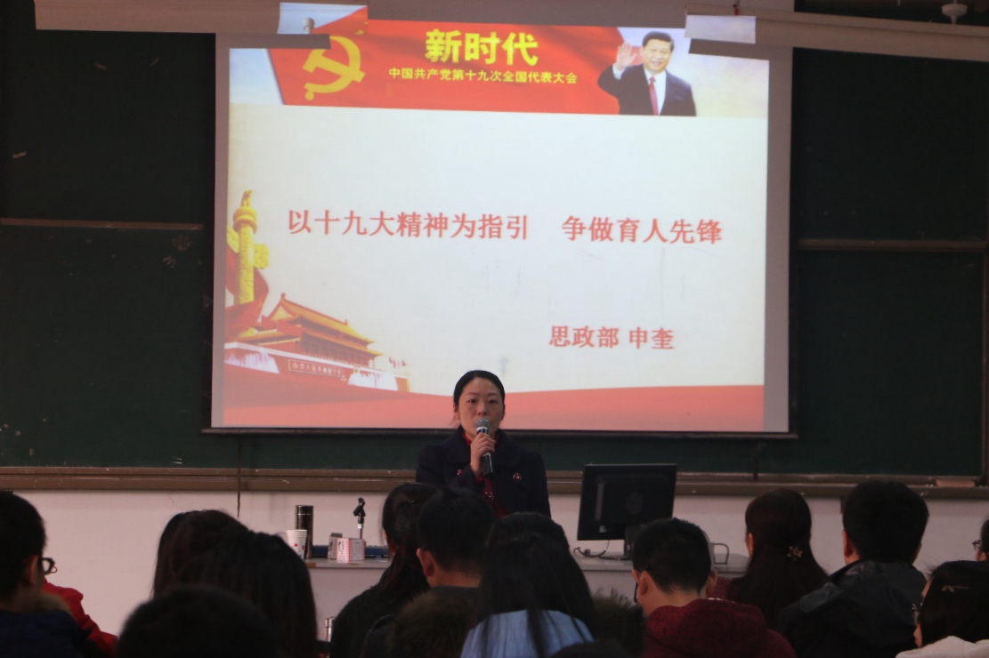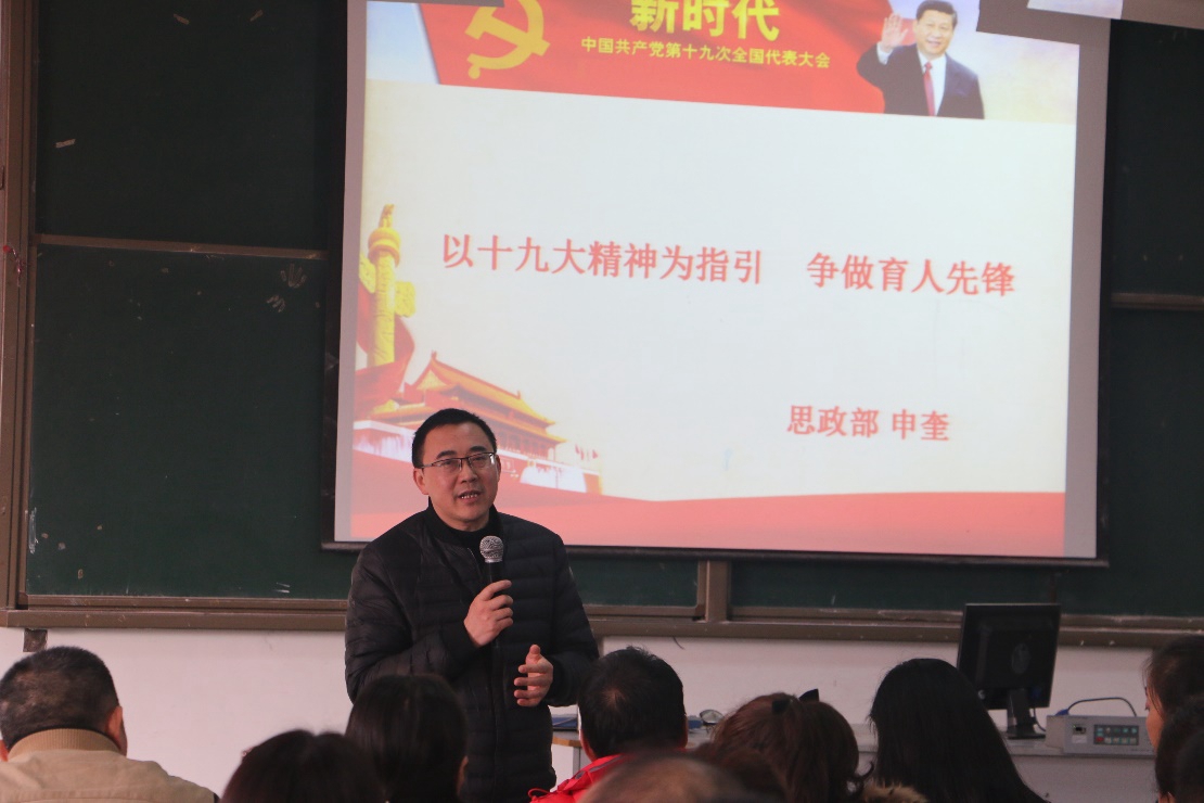 随后,申奎以《以十九大精神为指引 争做育人先锋》为题,结合实际从十九大精神解读、高等职业教育的机遇、高校教师如何做三个方面展开讲座。