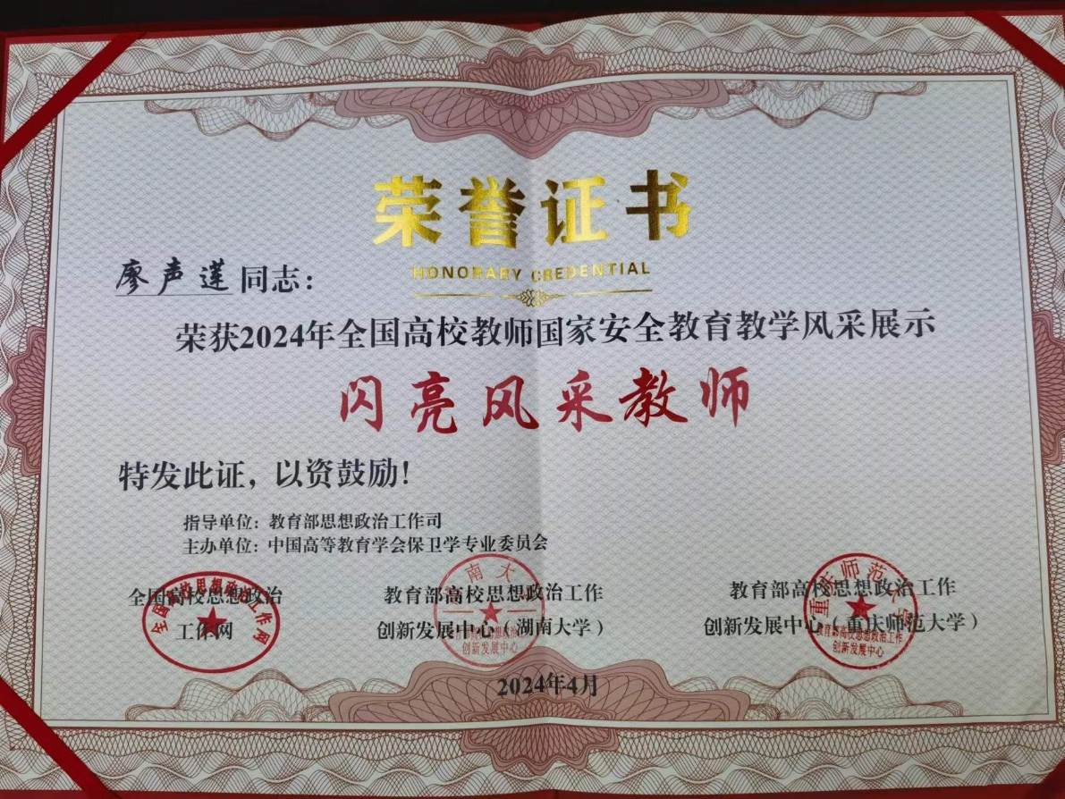 国家安全,人人有责。由教育部思想政治工作司指导,中国高等教育学会保卫学专业委员会、全国高校思想政治工作网、教育部高校思想政治工作创新发展中心(重庆师范大学、湖南大学)联合主办的2024年高校教师国家安全教育教学风采展示活动于2024411日在重庆师范大学进行精彩展示。开元官网马克思主义学院教师廖声莲以“坚持核安全观引领,铸牢国家安全屏障”为授课题目荣获“闪亮风采教师”称号。