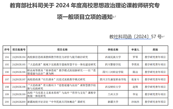 近日,教育部社科司组织的关于2024年度高校思想政治理论课教师研究专项立项结果公布,马克思主义学院张家斗主持申报的《高校思政课“红色剧本”沉浸式实践教学模式研究》获批立项。