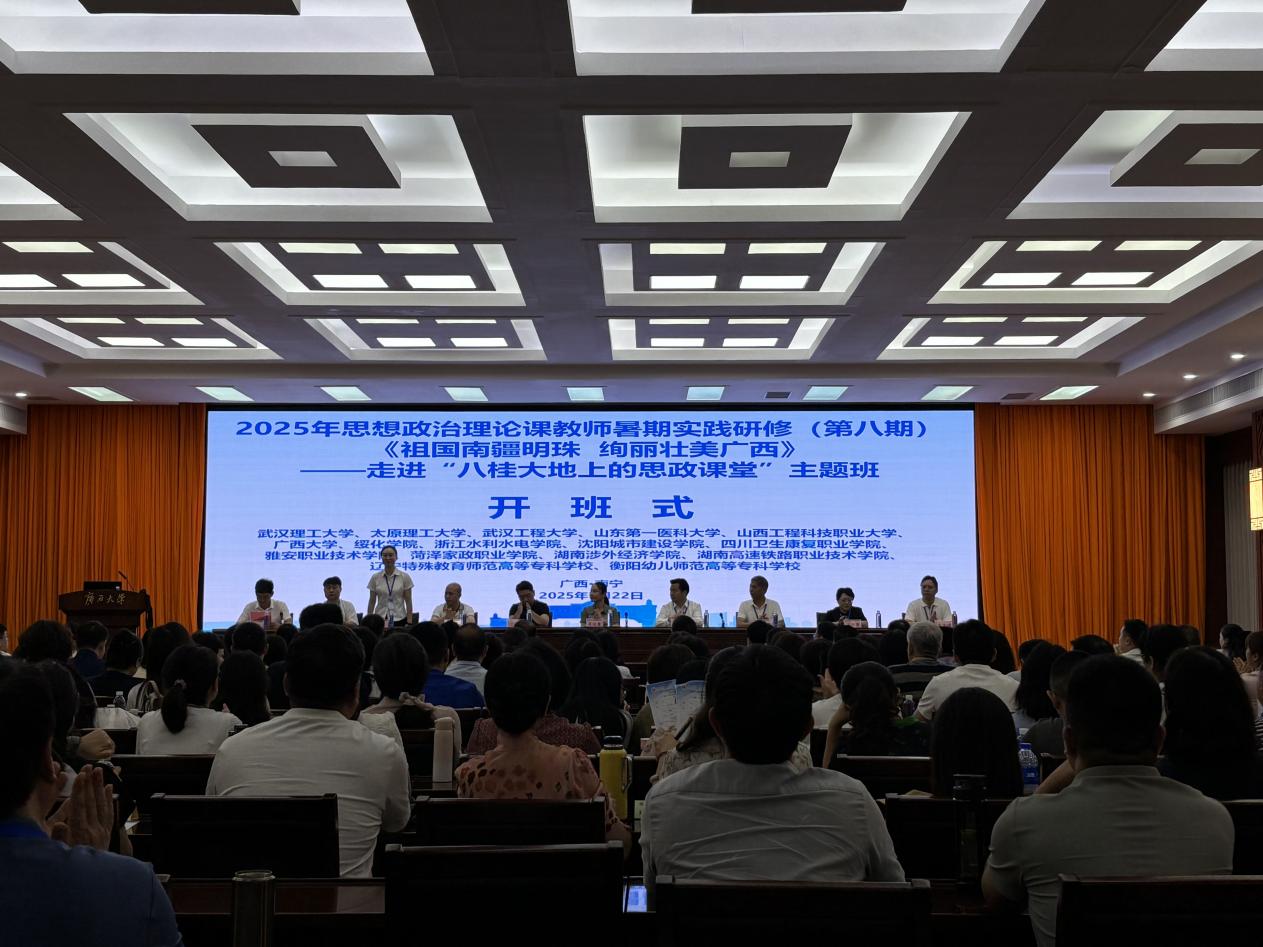 研修活动在广西大学马克思主义学院正式拉开帷幕。自治区新闻出版局原党组副书记、副局长黄健用专题《祖国南疆明珠 绚丽壮美广西——行走在八桂大地上新闻叙述的思政课堂》,以生动的语言和丰富的案例,将广西的自然美景与人文历史呈现在老师们眼前,为此次青秀山国家生态环境科普基地、“大思政”实践研修基地、广西壮族自治区博物馆、右江工农民主政府旧址、百谷红军村、百色起义纪念园、靖西鹅泉村、广西合那高、刘永福纪念馆、平陆运河、大清国一号界碑的实践研修拉开序幕。