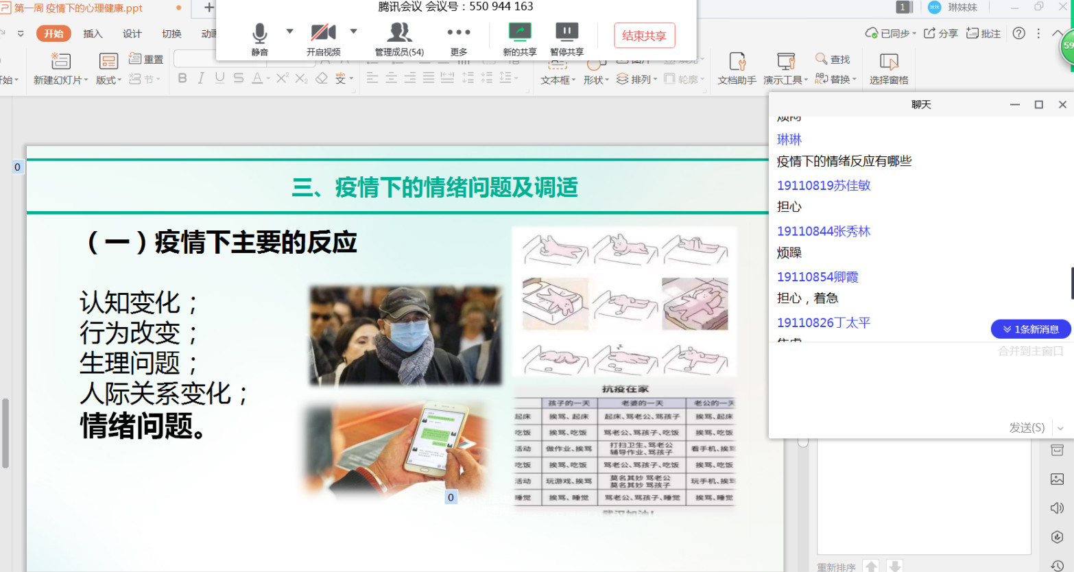 尽管已经参加过多次培训和演练,但是在前两天的授课中,个别老师对直播教学软件的操作还是不够熟练,比如“自言自语”了几分钟后才看到自己一不小心把声音关掉了。当然,偶尔的网络卡顿,使得老师们上课的声音从教师端的行云流水到了学生端就成了恐怖剧情的专用配音。还有,老师们和同学们互动得最多的一句话就是:歪,听(看)得到吗?嗯,听(看)得到。可是,这些丝毫都没有影响到同学们上课的热情,如有些同学听到老师们的声音以后就爱上了这门课,有些同学在下线之前还忍不住关心有点消瘦的老师,有些同学下课后还在学习通上继续发言讨论等。