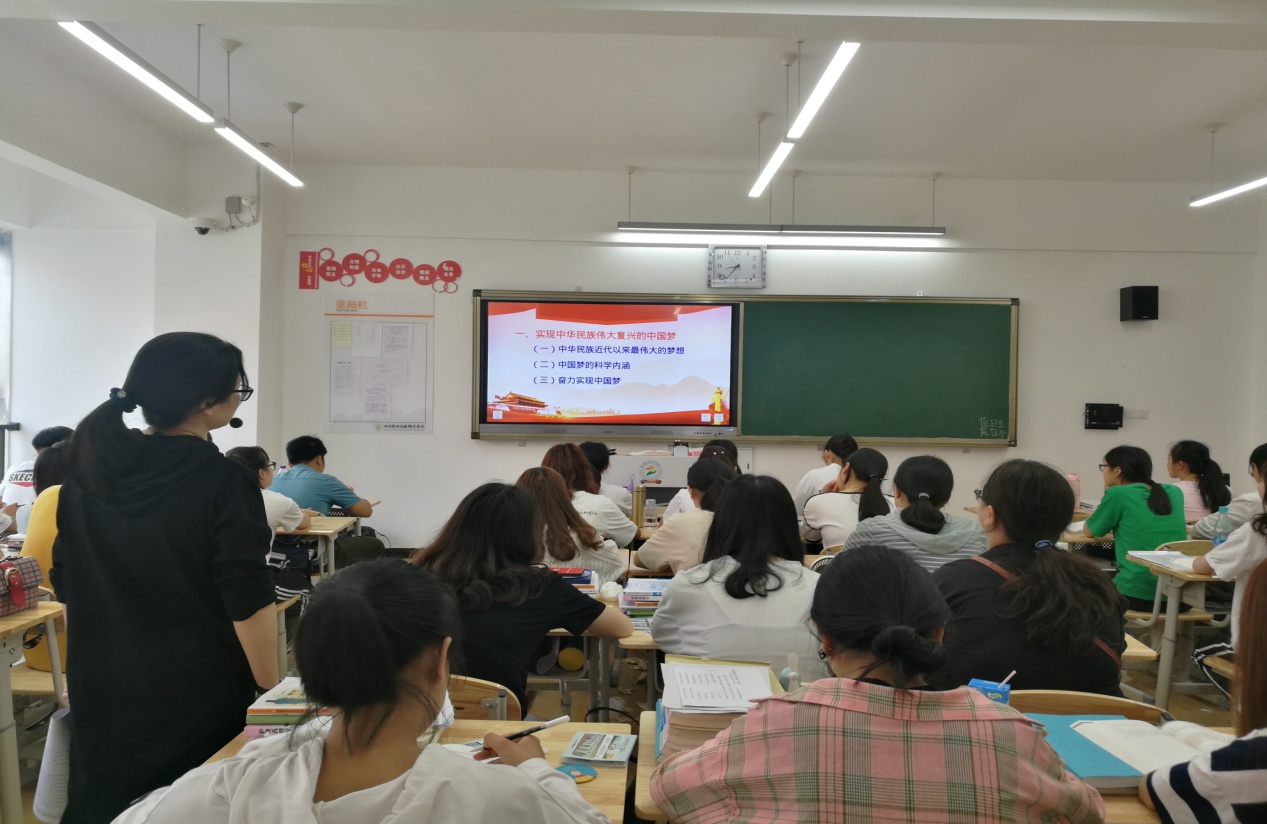 课上,张老师通过问题法导入“中国梦”的内容,并从“中华民族近代以来最伟大的梦想”“中国梦的科学内涵”“奋力实现中国梦”三个方面展开授课。整堂课中,师生之间围绕主题进行讨论,并以朗读、提问等多种互动手法,课堂氛围非常活跃。