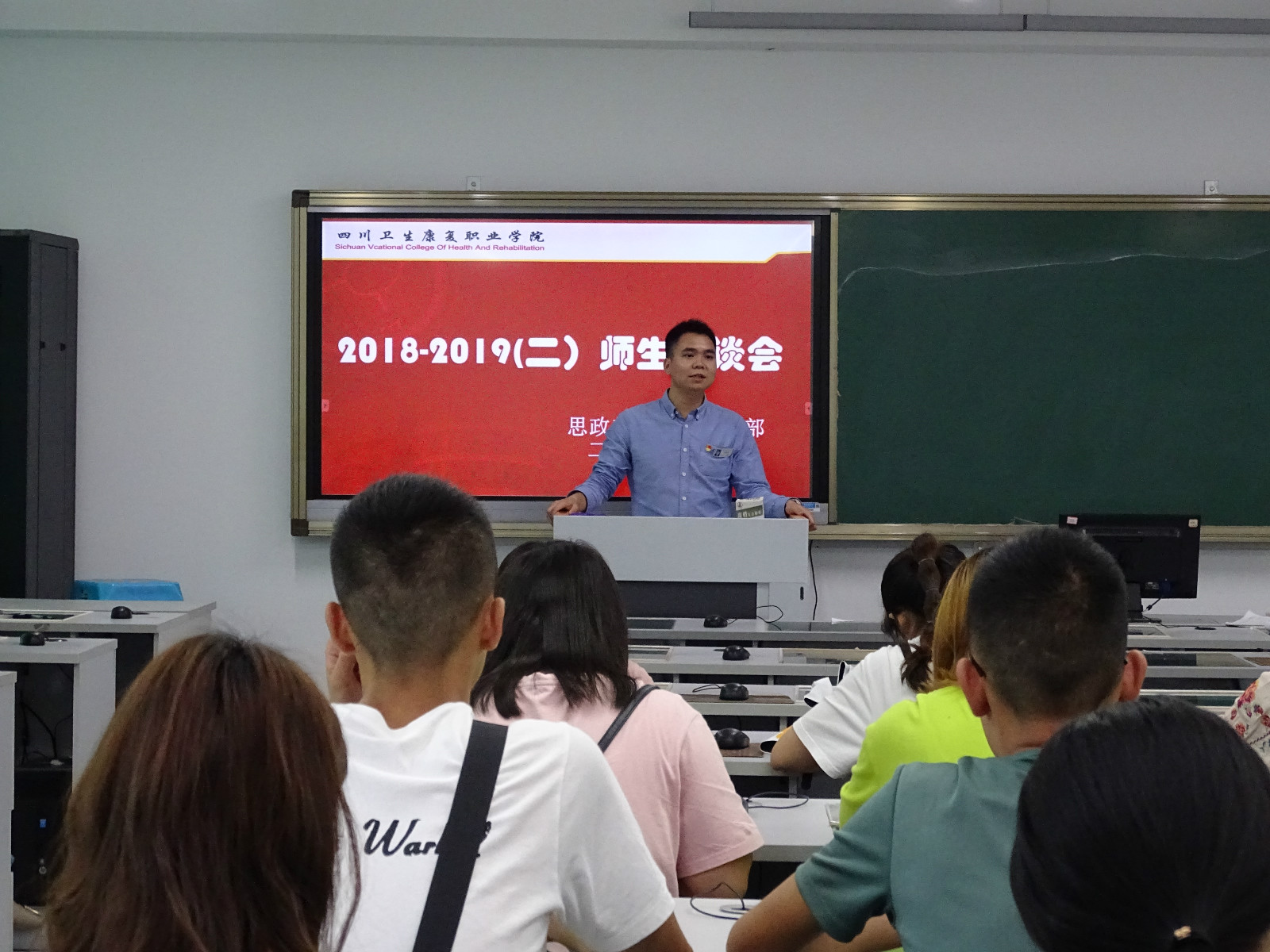 6月12日下午,思政部和人文社科部在4-C605联合举办师生座谈会。人文社科部副主任马应安、两系部教学干事、教研室主任、教师代表及2018级各班学生代表50余人参加了座谈会。会议由思政部副主任罗智凯主持。