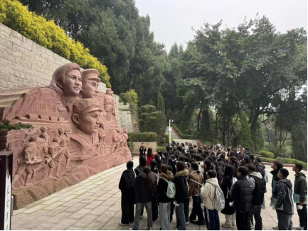在革命烈士陵园烈士纪念碑前,同学们手持洁白鲜花,向革命先烈默哀致敬,在无声的凝望中与先烈“对话”,感悟革命精神的力量。